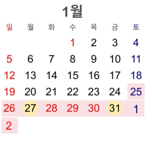 이에 따라 27일이 임시공휴일로 지정되면, 25~26일 주말과 28~30일 설 연휴를